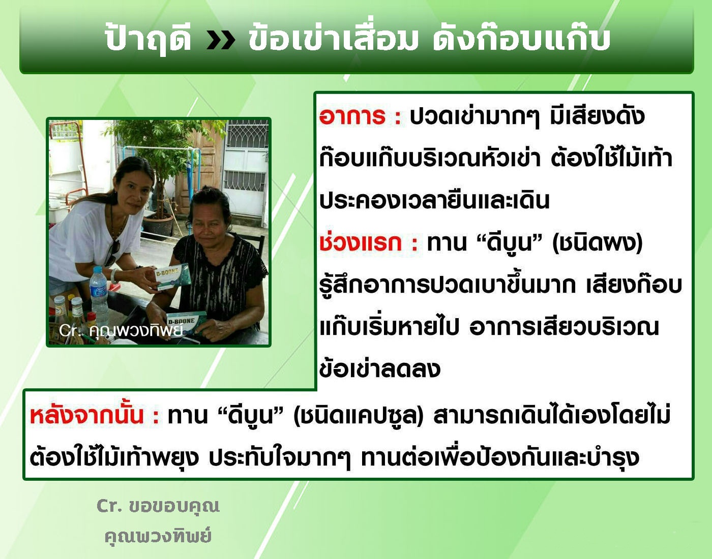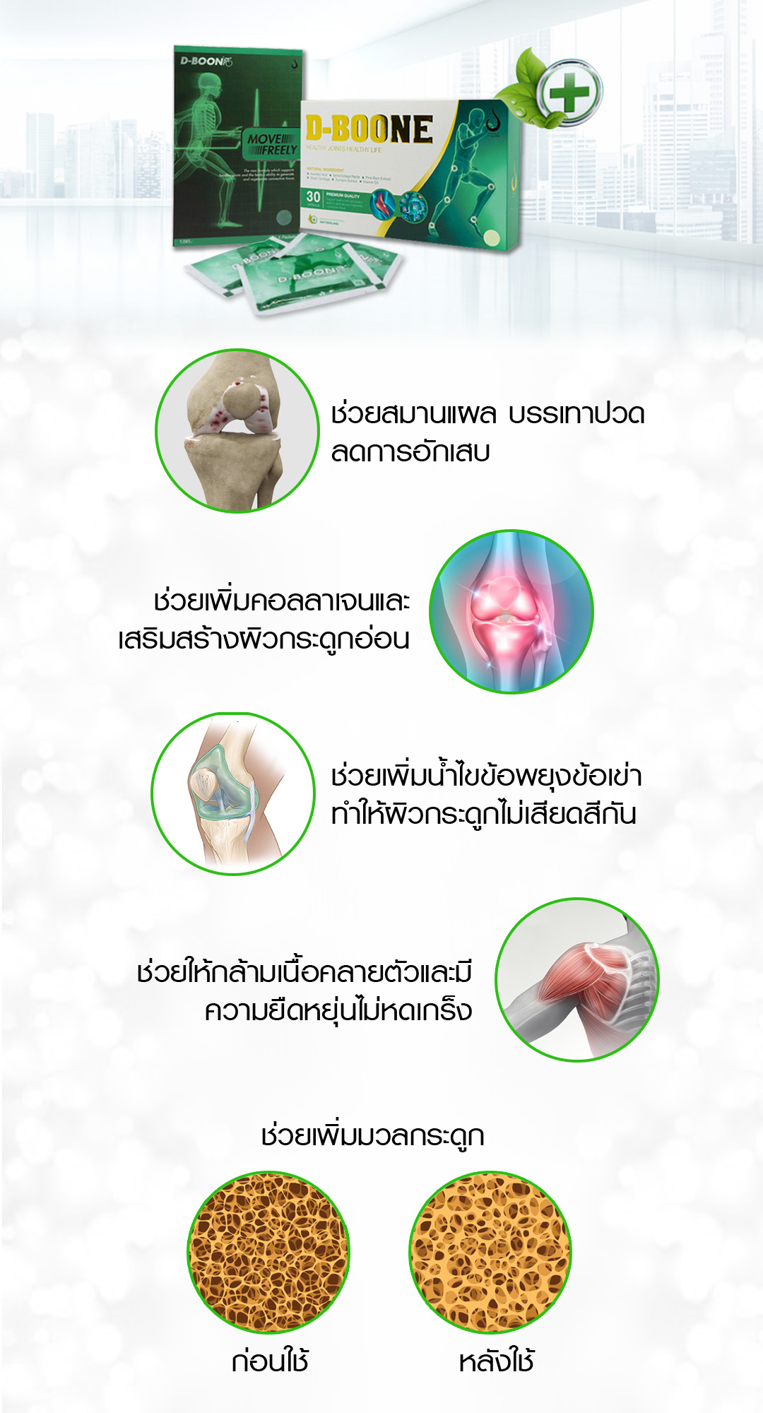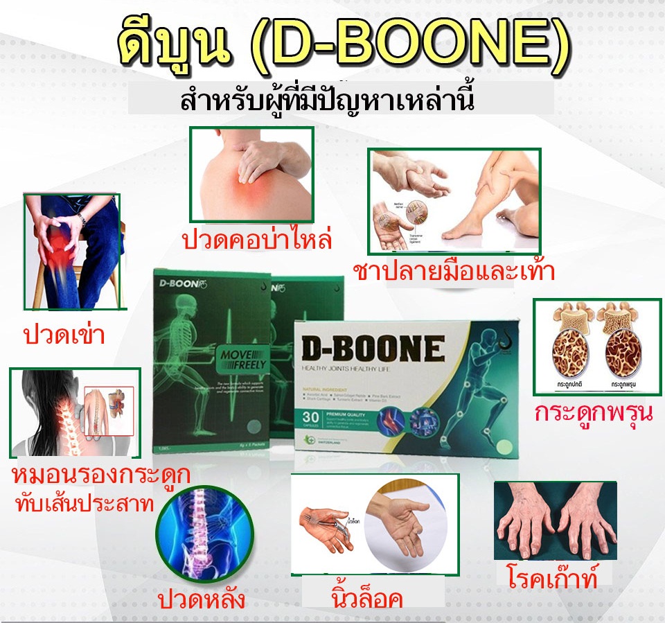 A: ช่วยบำรุงไขข้อ จุดข้อต่อต่างๆของร่างกาย รวมถึงผู้ป่วยที่เป็นโรครูมาตอยด์ พาร์กินสัน เก๊าท์ ส่วนวัยกำลังโต สามารถเพิ่มความสูงได้เป็นอย่างดี และการทานดีบูนเป็นประจำ จะทำให้ไขกระดูกมีความแข็งแรง ทำให้การผลิตเลือดมีประสิทธิภาพสูง